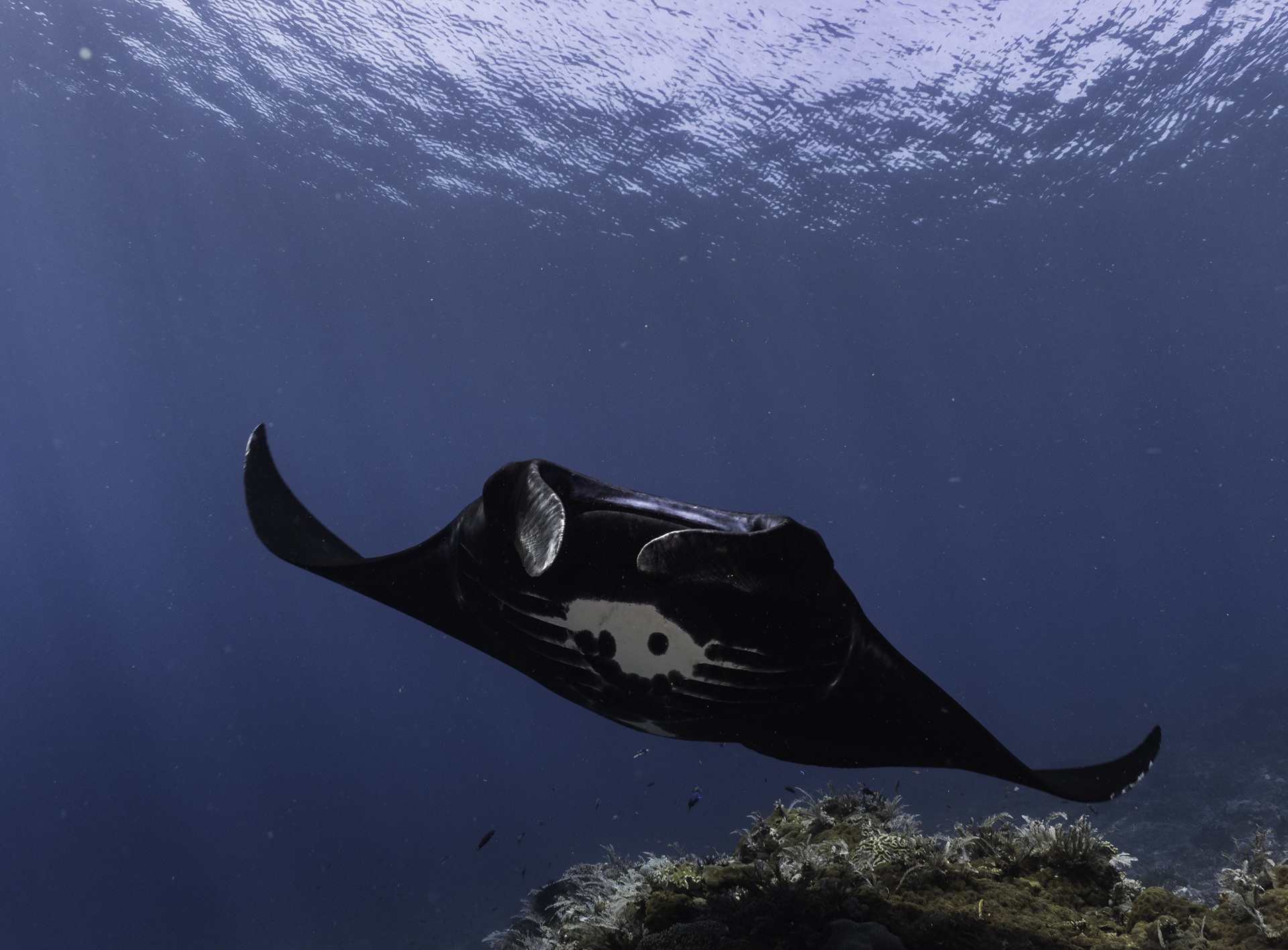 One of Mawan’s biggest draws is its shallow-water manta encounters. Between September and June, reef mantas (Mobula alfredi) often visit the sandy slope just off the island to feed and be cleaned by small reef fish.